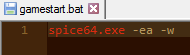 For our local network configuration example, on a single line in the .bat file we're going to type spice64.exe -ea -w and save the file.
