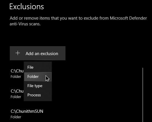 Add an exclusionbutton, select thefolderoption, navigate to the root of your game installation and clickSelect Folder.